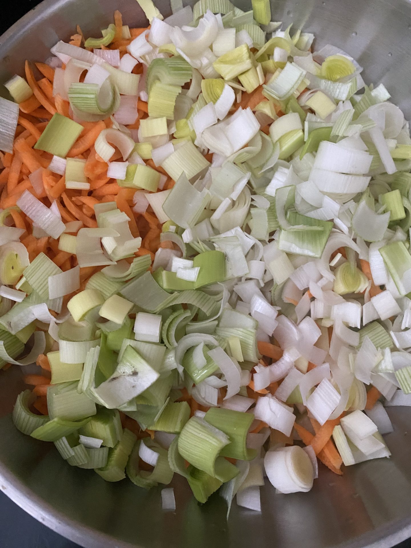 - Faites chauffer les 2 CS d’huile d’olive et mettez à cuire l’oignon quelques minutes, ajoutez les carottes et les poireaux.