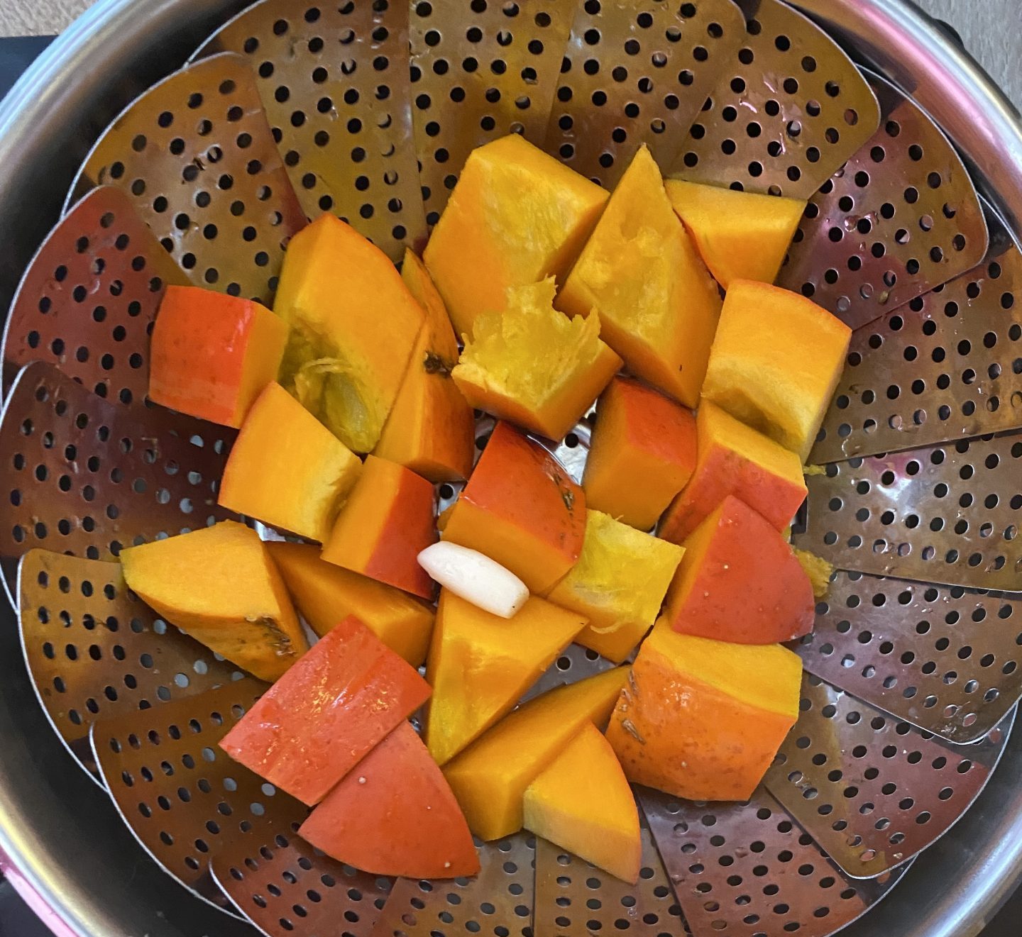 - Passez le potimarron sous l’eau, coupez le en morceaux (il n’est pas nécessaire de l’éplucher) placez-les dans la marguerite pour une cuisson vapeur pendant 20 min.