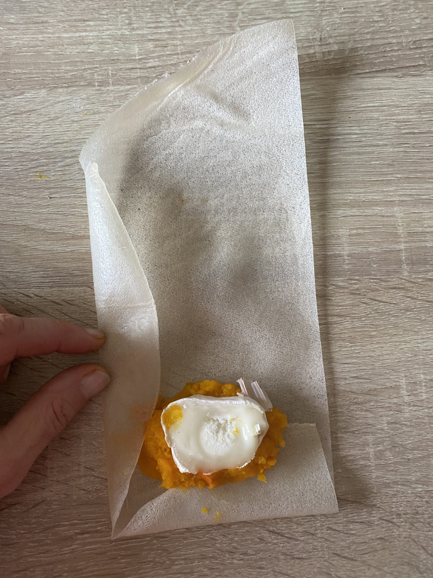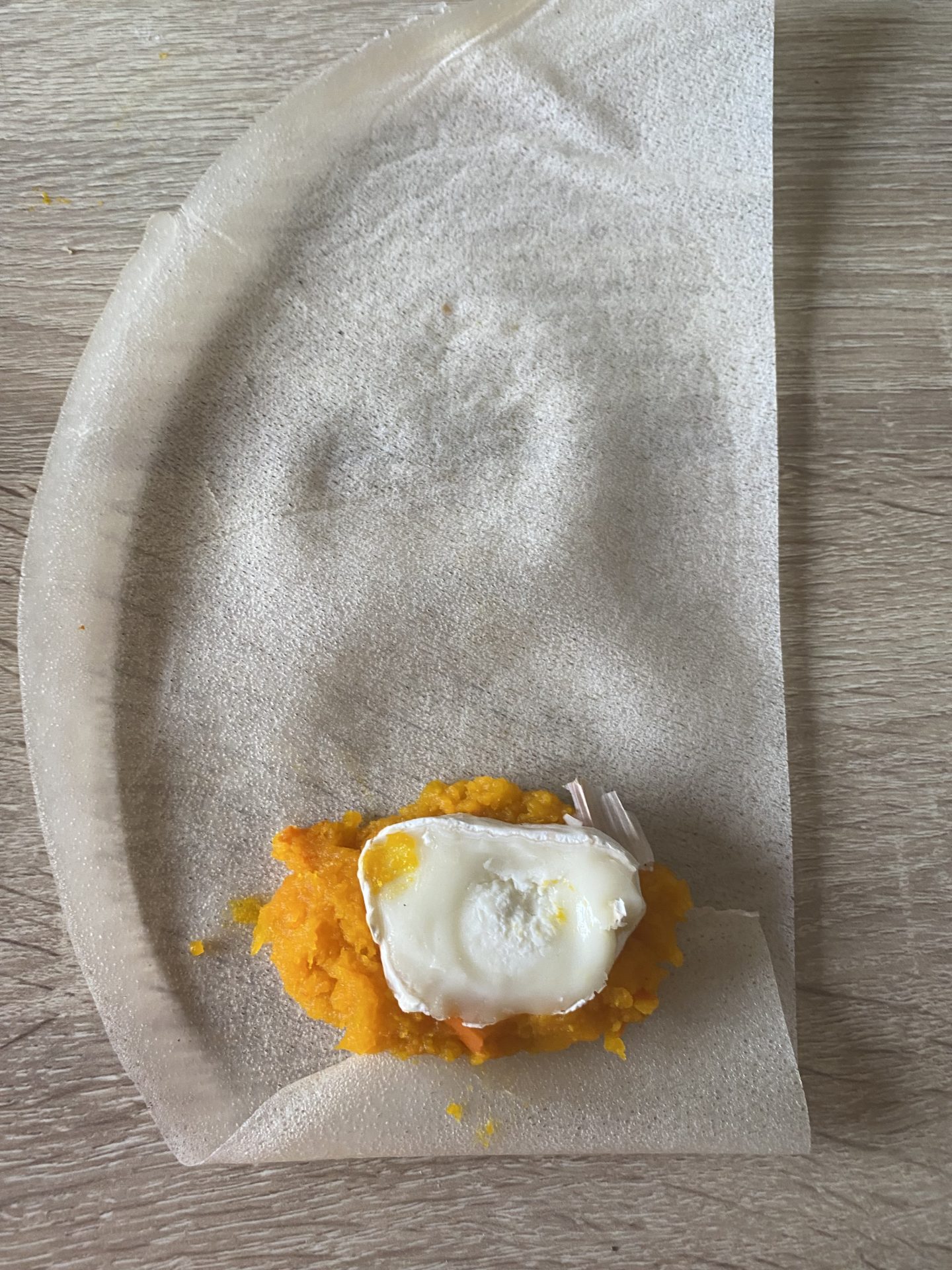 - Coupez la feuille de brick en deux et placez une cuillère à soupe de purée, puis une tranche de chèvre.