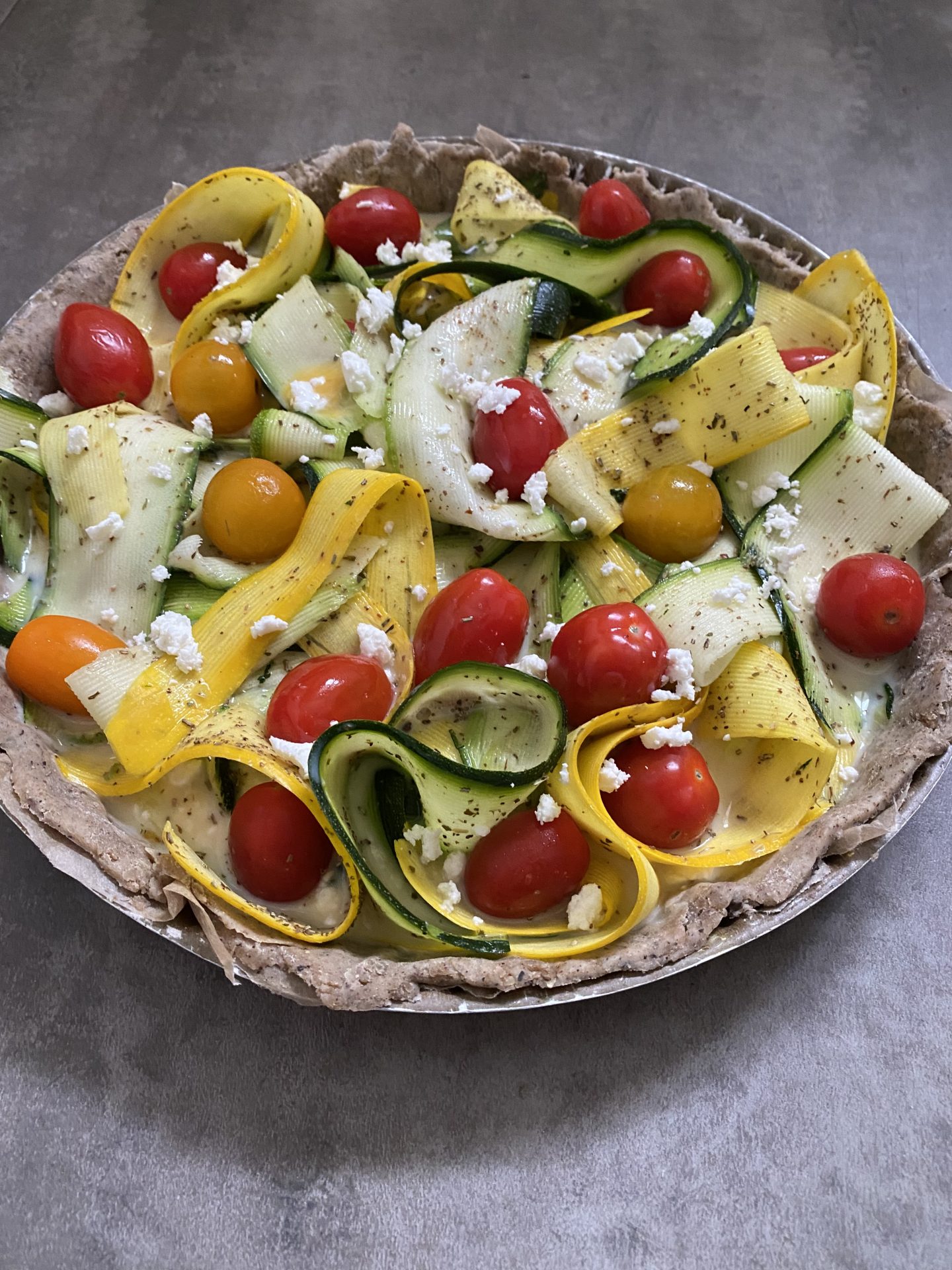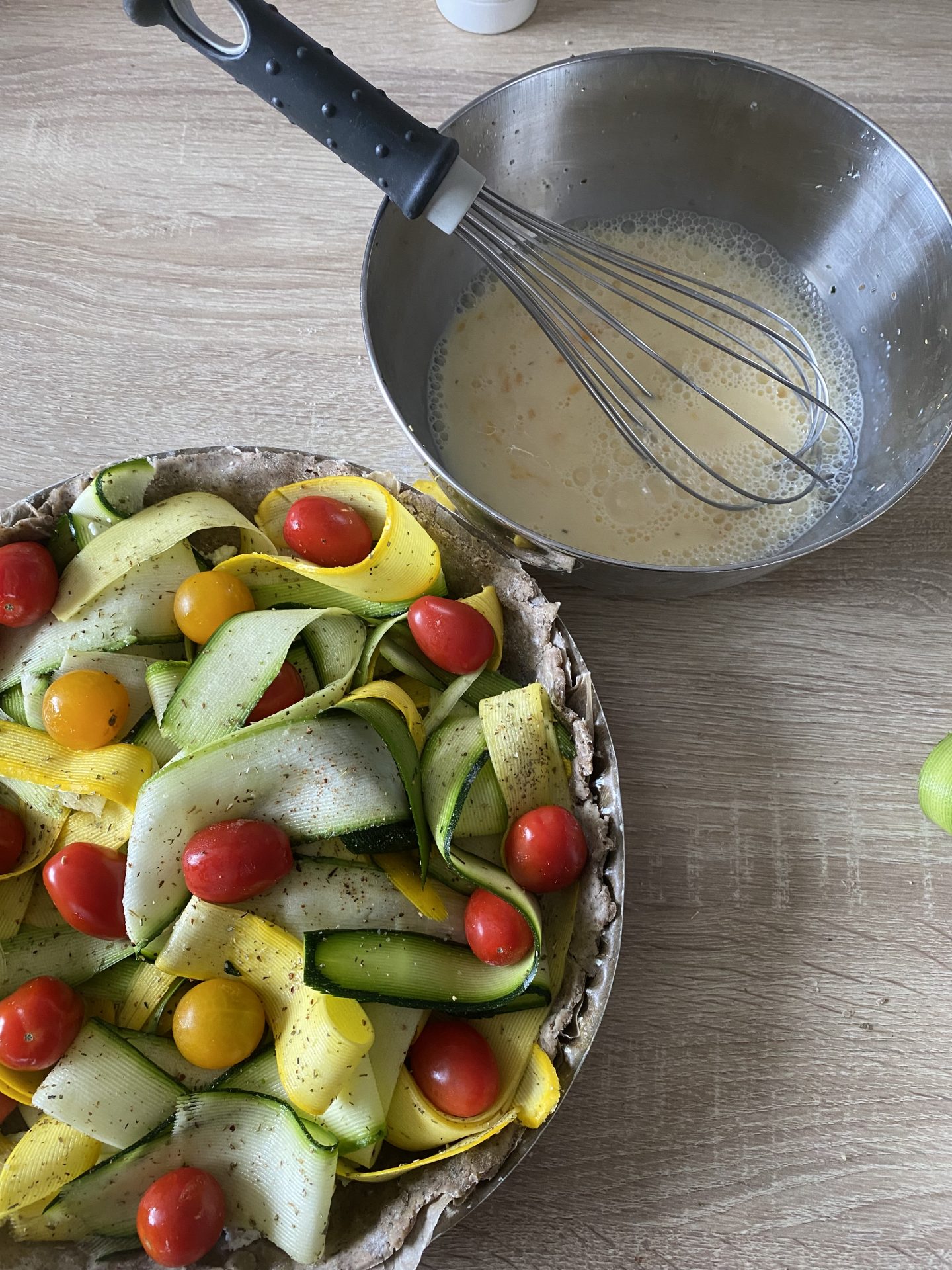 • Déposez-les sur le fond de pâte et disposez les tomates cerise.