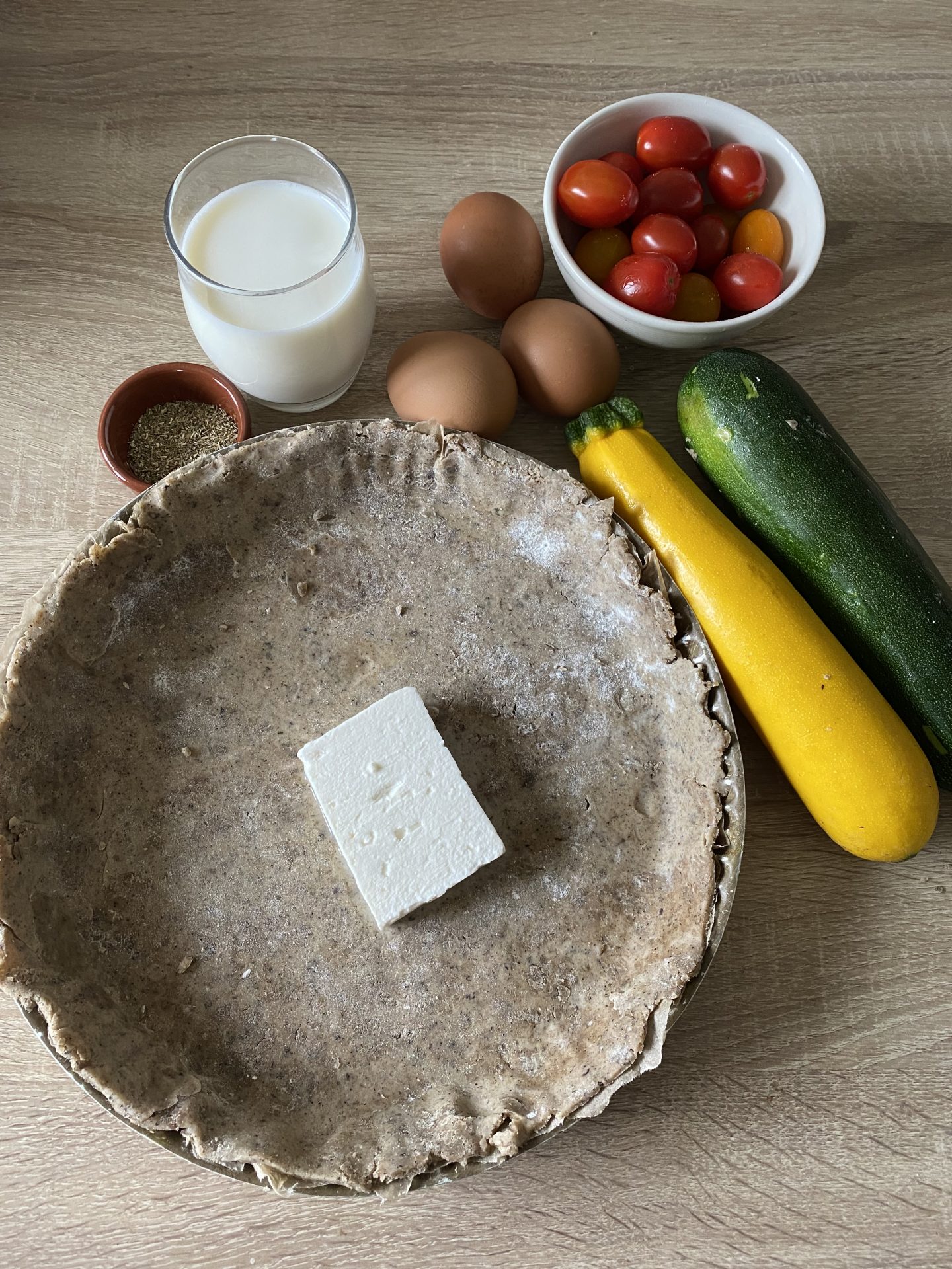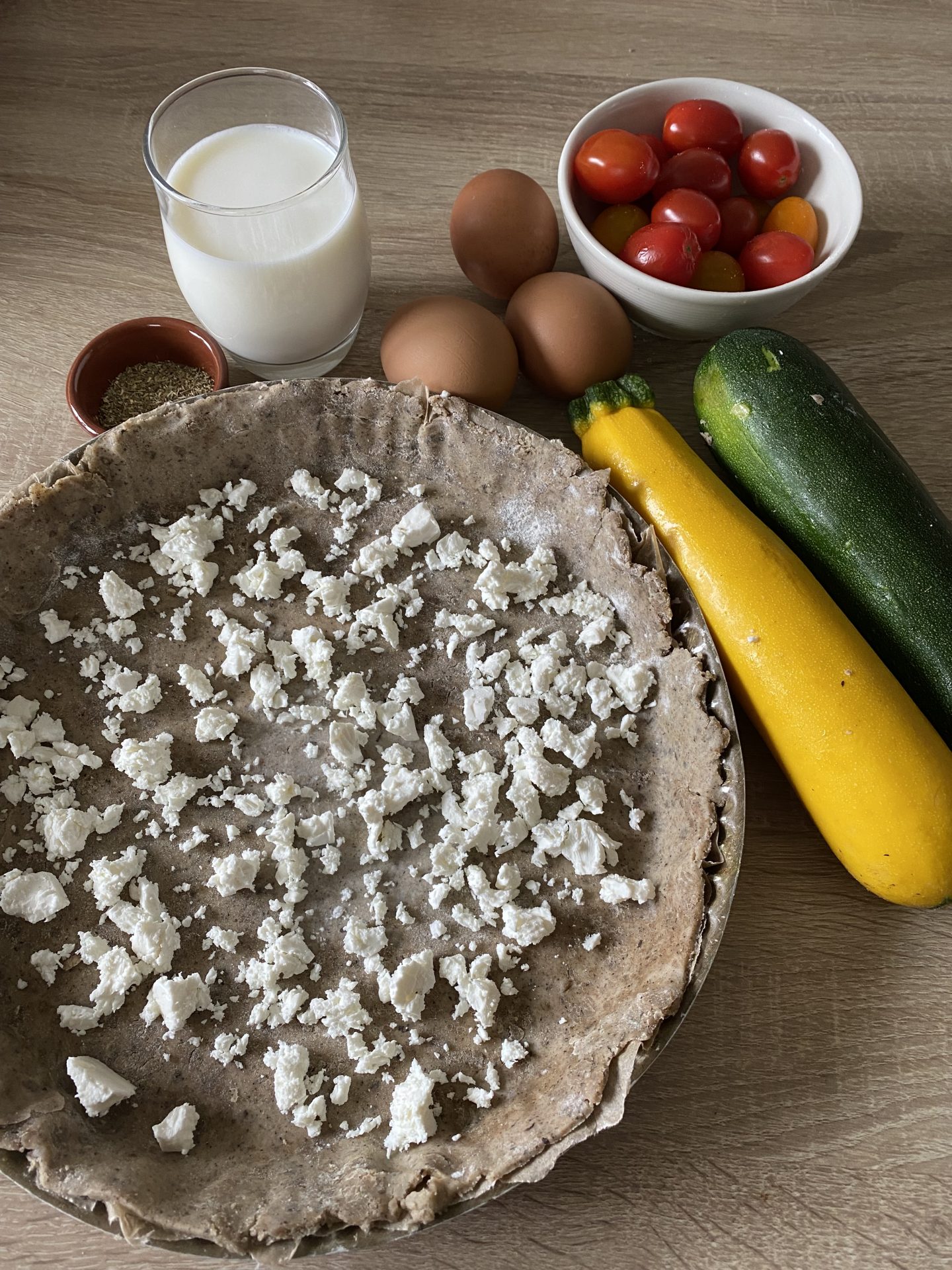 • Emiettez la fêta et parsemez-la sur la pâte brisée.