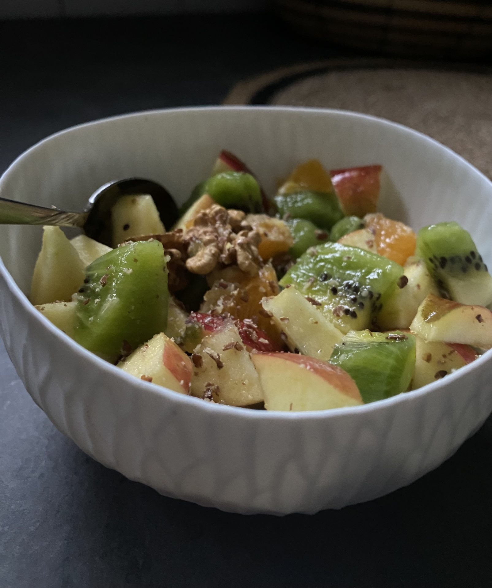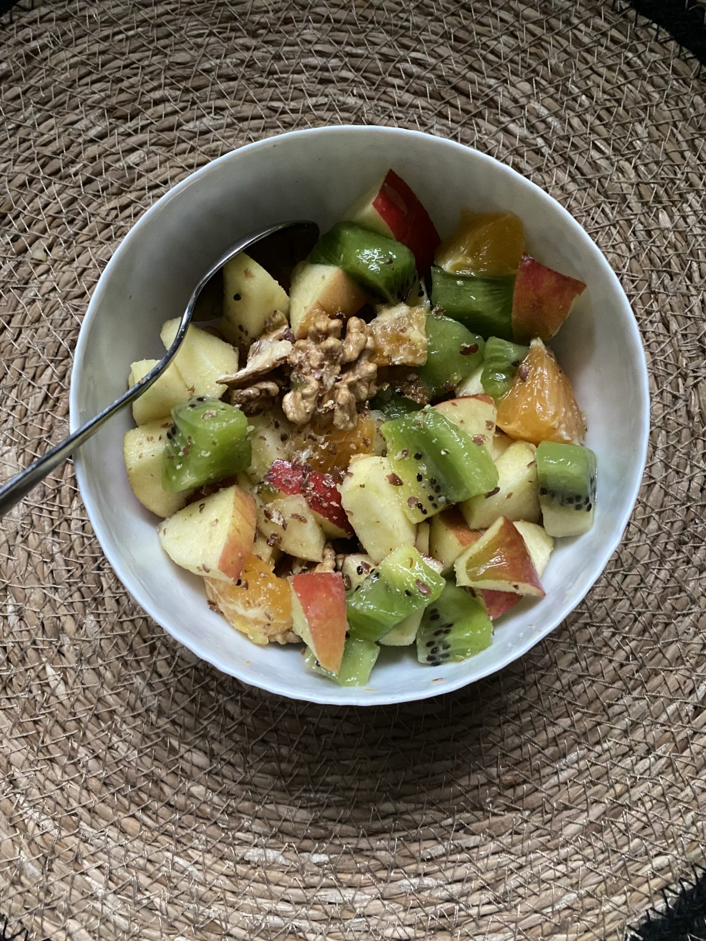 7. Pour terminer, et donner une touche d’oméga 3 je vous invite à ajouter des cerneaux de noix et de moudre au moment de déguster votre salade de fruit des graines de lin.