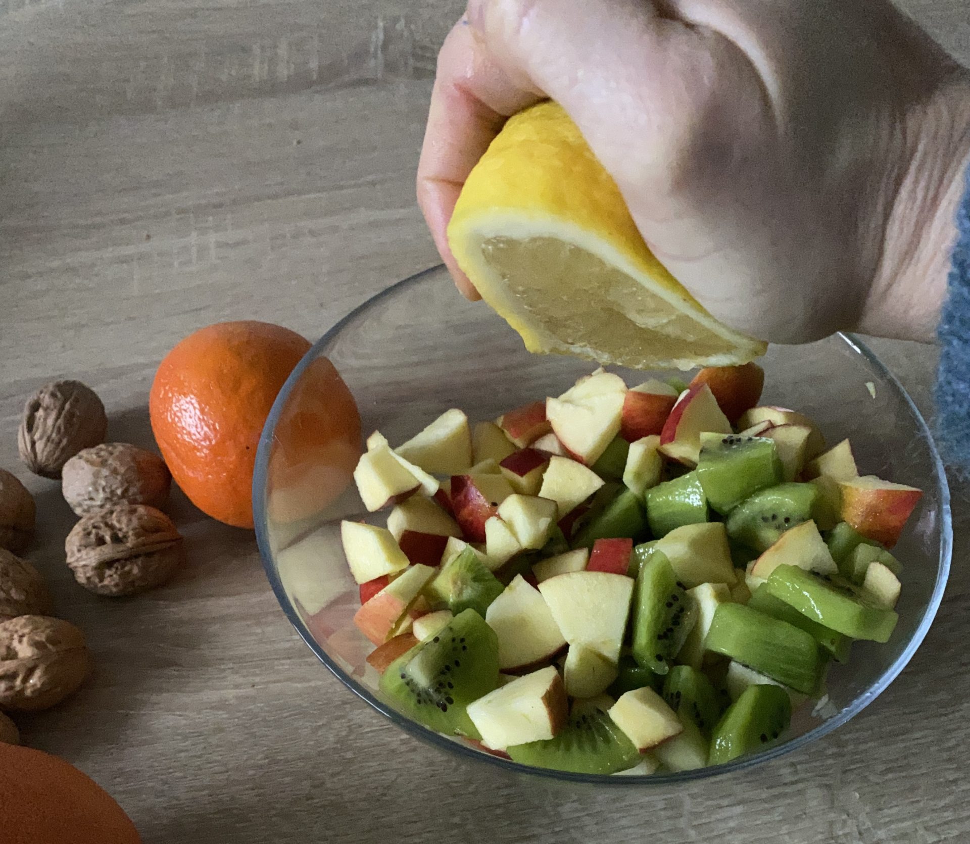 3. Pressez le jus du demi citron sur les fruits pour éviter qu’ils ne s’oxydent et ajouter encore un peu de vitamine C.